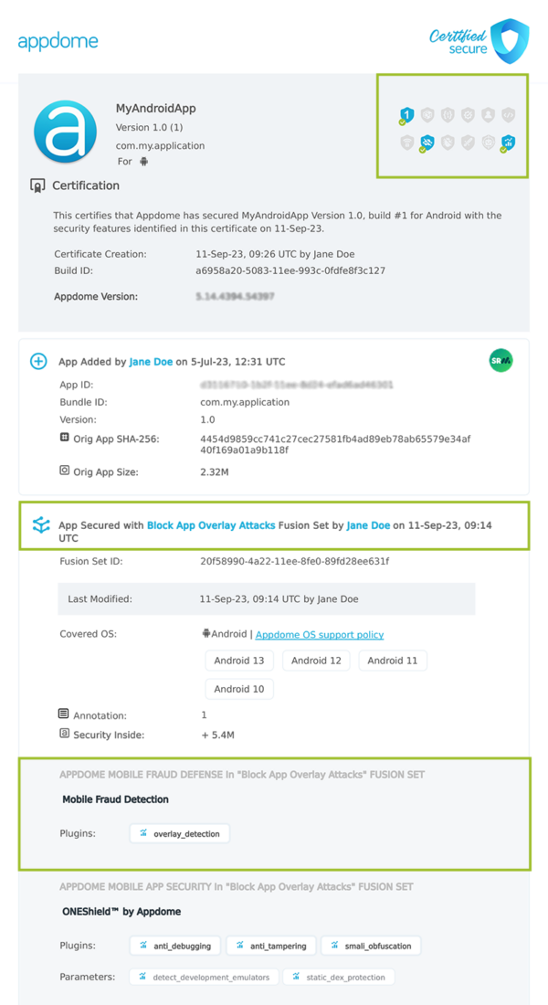 Each Certified Secure™ certificate provides DevOps and DevSecOps organizations the entire workflow summary, audit trail of each build, and proof of protection that Detect Overlay Attacks has been added to each Android app. Certified Secure provides instant and in-line DevSecOps compliance certification that Detect Overlay Attacks and other mobile app security features are in each build of the mobile app.