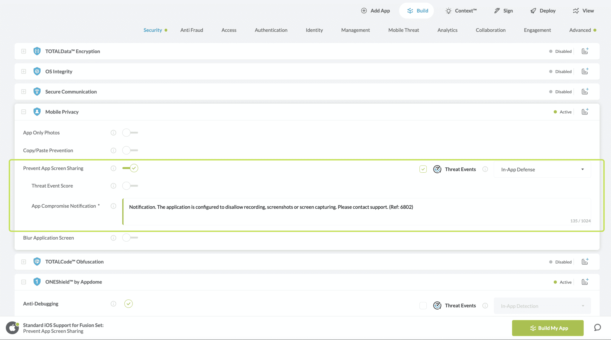 On Appdome, follow these 3 simple steps to create self-defending iOS Apps that Prevent Screen Sharing Scams & Malware without an SDK or gateway: