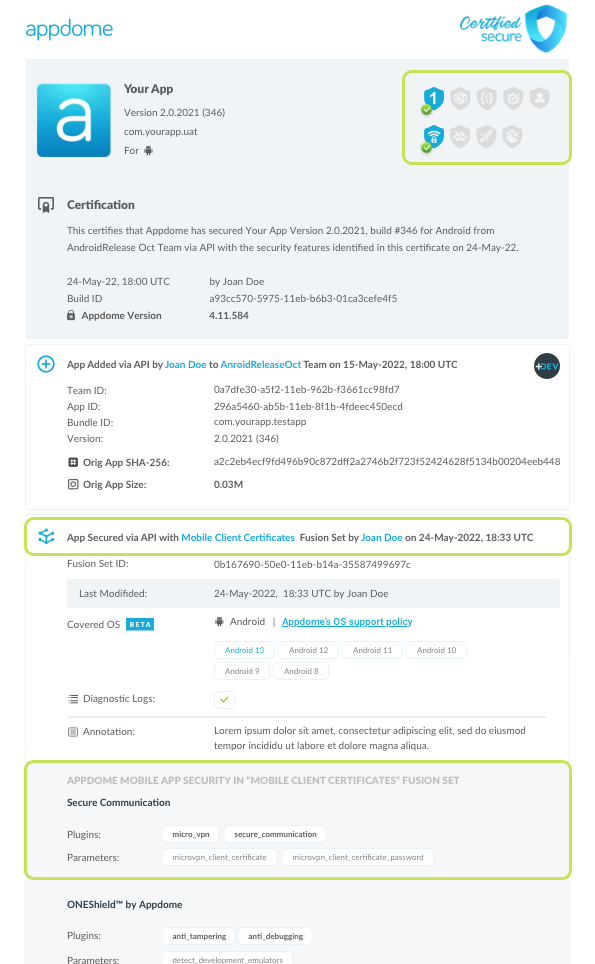 Each Certified Secure™ certificate provides DevOps and DevSecOps organizations the entire workflow summary, audit trail of each build, and proof of protection that Bot Defense-Mobile Client Certificates has been added to each Mobile app. Certified Secure provides instant and in-line DevSecOps compliance certification that Bot Defense-Mobile Client Certificates and other mobile app security features are in each build of the mobile app.