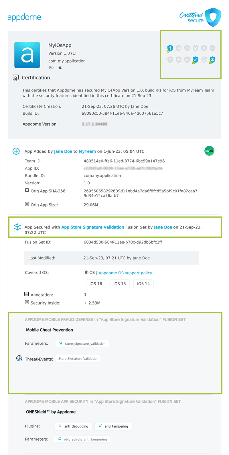 Each Certified Secure™ certificate provides DevOps and DevSecOps organizations the entire workflow summary, audit trail of each build, and proof of protection that App Store Signature Validation has been added to each iOS app. Certified Secure provides instant and in-line DevSecOps compliance certification that App Store Signature Validation and other mobile app security features are in each build of the mobile app.