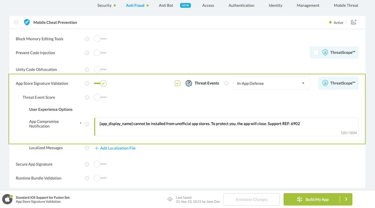 With Threat-Events™ enabled (turned ON), iOS developers can get detailed attack intelligence and granular defense control in iOS applications and create amazing user experiences for all mobile end users when App Store Signature is detected.
