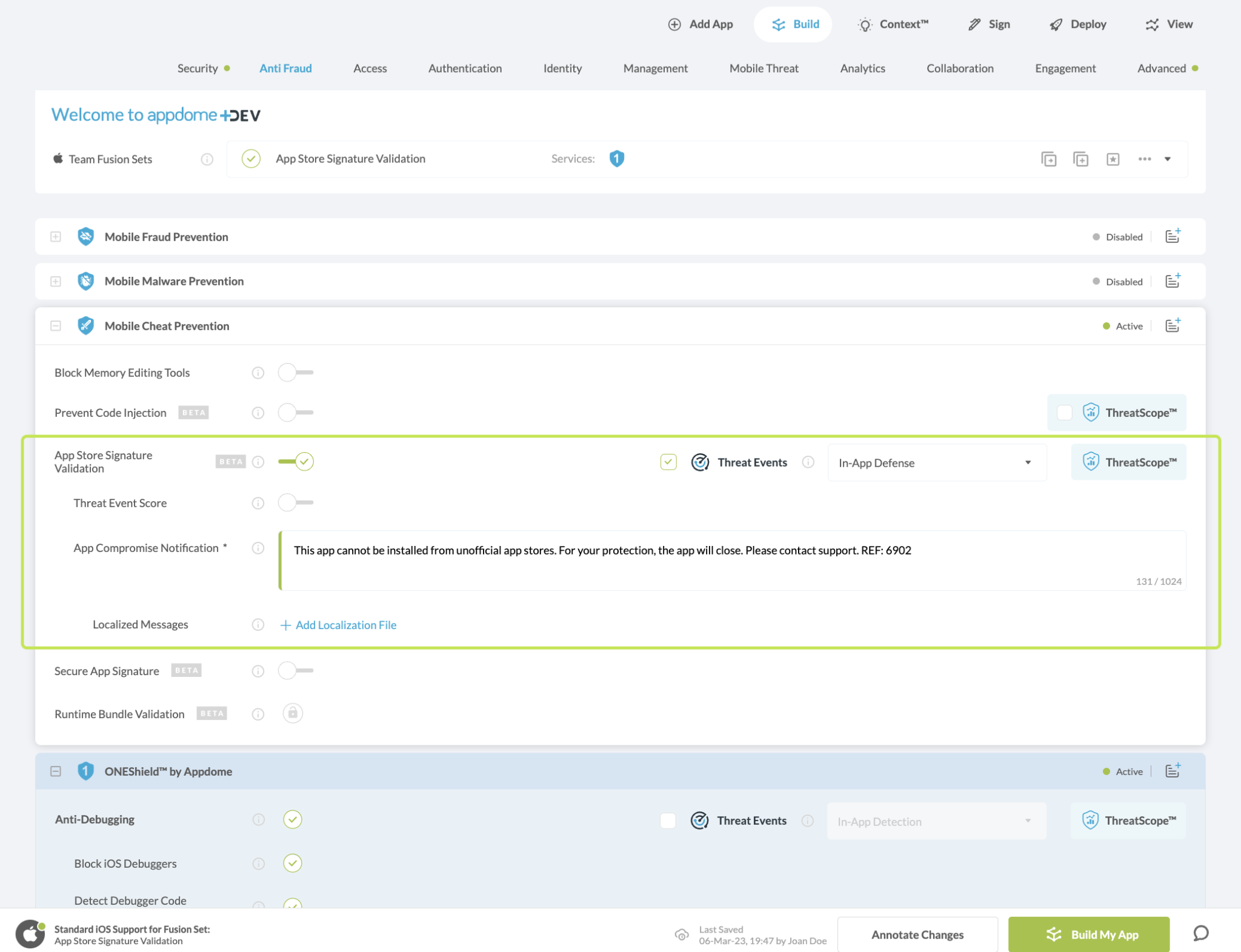 Figure 2: Fusion Set that displays the newly added App Store Signature Validation protection