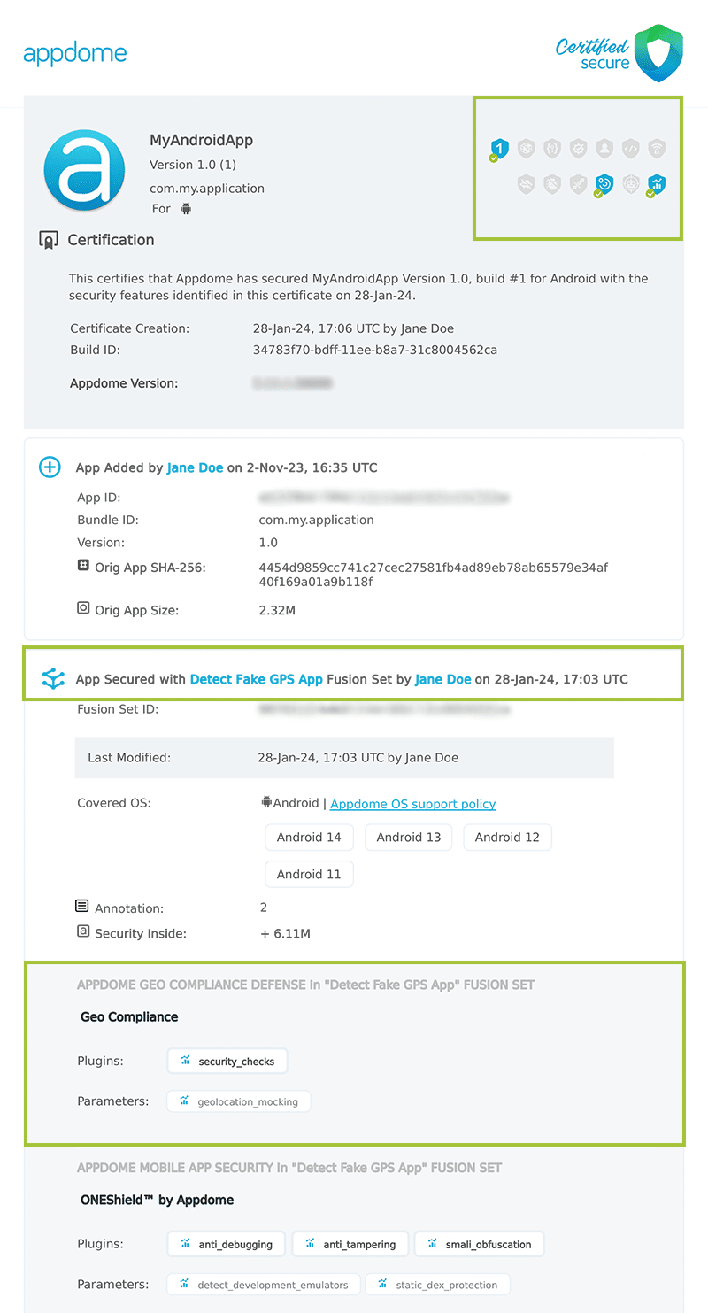 Each Certified Secure™ certificate provides DevOps and DevSecOps organizations the entire workflow summary, audit trail of each build, and proof of protection that Detect Fake GPS App has been added to each Mobile app. Certified Secure provides instant and in-line DevSecOps compliance certification that Detect Fake GPS App and other mobile app security features are in each build of the mobile app.
