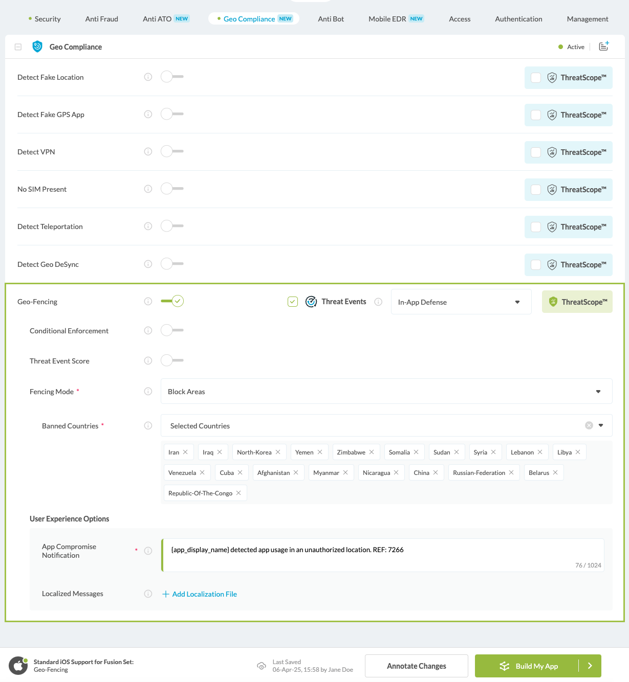With Threat-Events™ enabled (turned ON), iOS developers can get detailed attack intelligence and granular defense control in iOS applications and create amazing user experiences for all mobile end users when Geo-Fencing is detected.