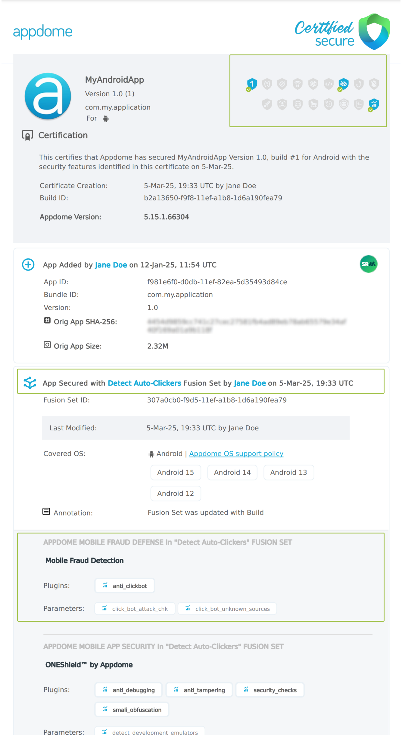 Each Certified Secure™ certificate provides DevOps and DevSecOps organizations the entire workflow summary, audit trail of each build, and proof of protection that Detect Auto-Clickers has been added to each Android app. Certified Secure provides instant and in-line DevSecOps compliance certification that Detect Auto-Clickers and other mobile app security features are in each build of the mobile app.