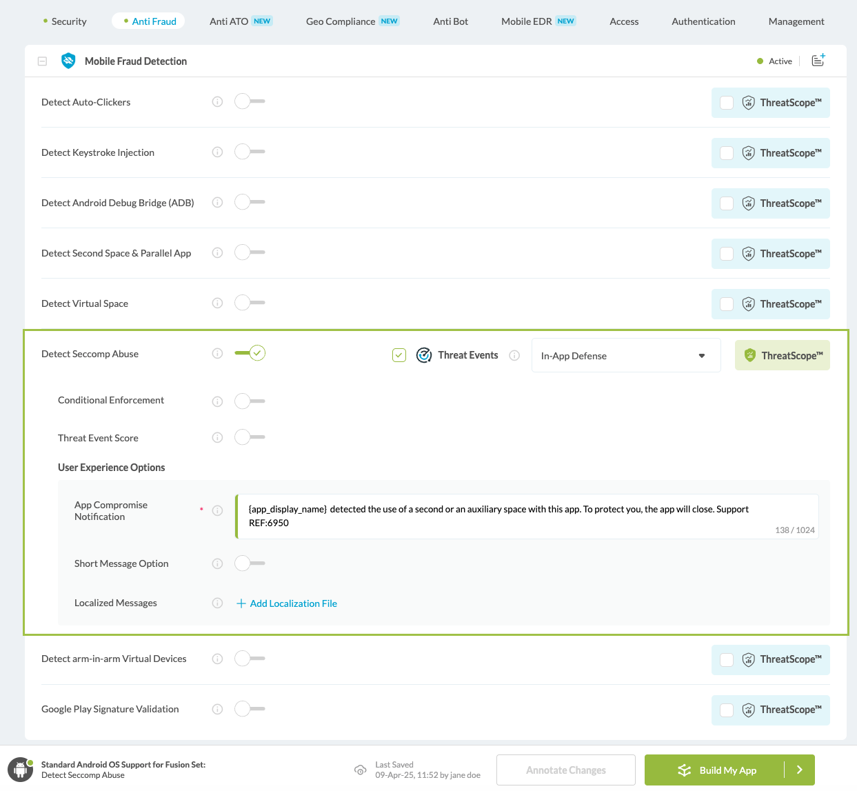 Follow the steps in Sections 2.2-2.2.2 of this article to add the Detect Seccomp Abuse feature to your Fusion Set via the Appdome Console.