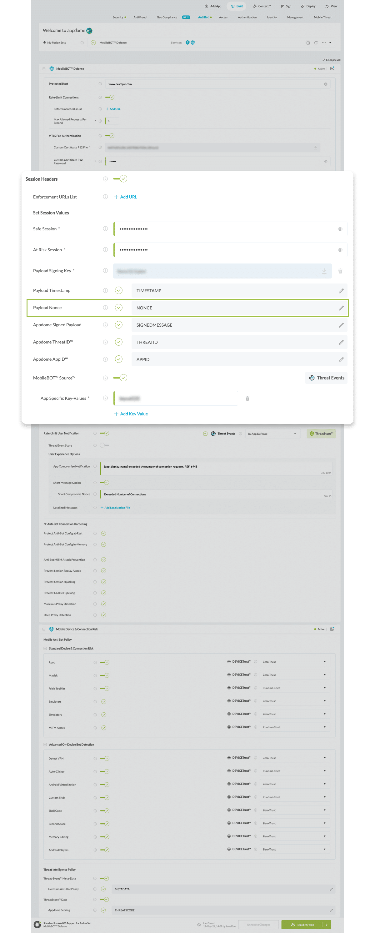 Appdome’s MobileBOT™ Defense integrates Nonce Payload validation into its Anti-Bot Payload mechanism, ensuring secure, one-time token generation during critical points in the app’s operation. When the Nonce Payload is generated, it is securely transmitted to the server, where it is validated. If any attempt to replay or reuse the token is detected, Appdome invalidates the session and prevents further communication. This process not only stops replay attacks but also enhances the overall security framework by ensuring that each session remains unique and valid, thus preventing unauthorized access and maintaining the app’s integrity.
