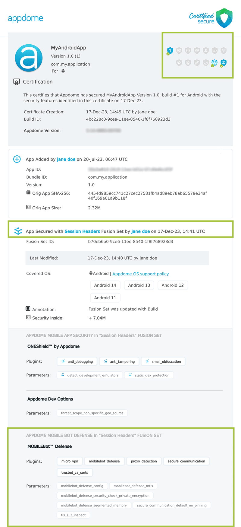 Each Certified Secure™ certificate provides DevOps and DevSecOps organizations the entire workflow summary, audit trail of each build, and proof of protection that Nonce in Payload has been added to each Mobile app. Certified Secure provides instant and in-line DevSecOps compliance certification that Nonce in Payload and other mobile app security features are in each build of the mobile app.