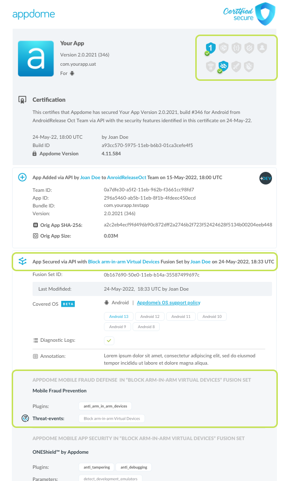 Each Certified Secure™ certificate provides DevOps and DevSecOps organizations the entire workflow summary, audit trail of each build, and proof of protection that Detect ARM-in-ARM Virtual Devices has been added to each Mobile app. Certified Secure provides instant and in-line DevSecOps compliance certification that Detect ARM-in-ARM Virtual Devices and other mobile app security features are in each build of the mobile app.
