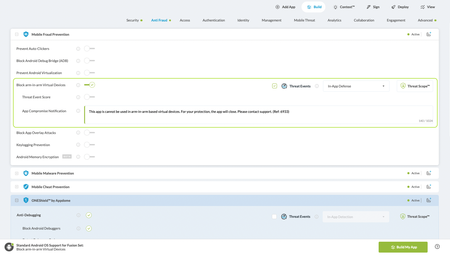 On Appdome, follow these 3 simple steps to create self-defending Mobile Apps that Detect ARM-in-ARM Virtual Devices without an SDK or gateway: