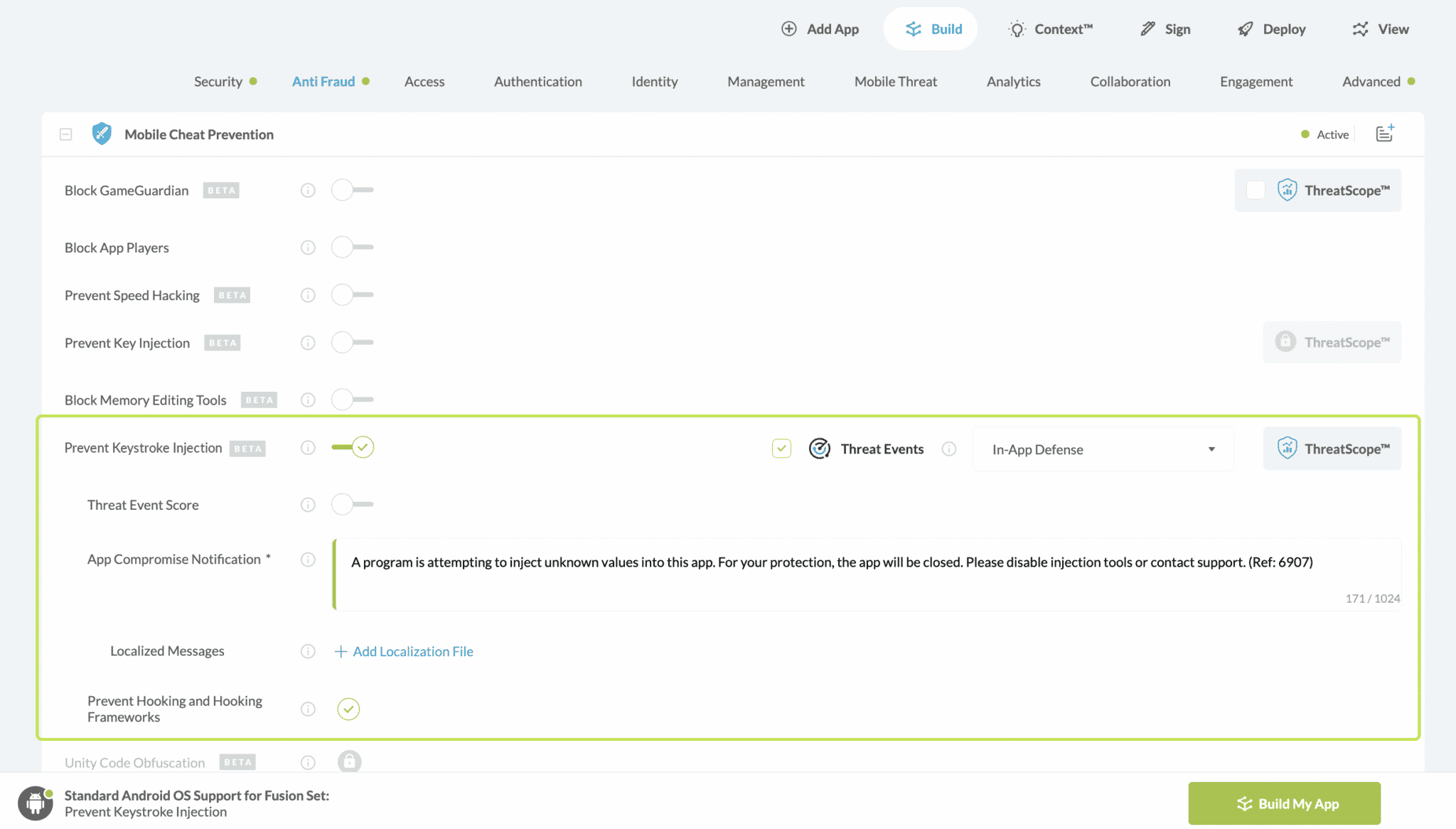 On Appdome, follow these 3 simple steps to create self-defending Android Apps that Detect Keystroke Injection without an SDK or gateway: