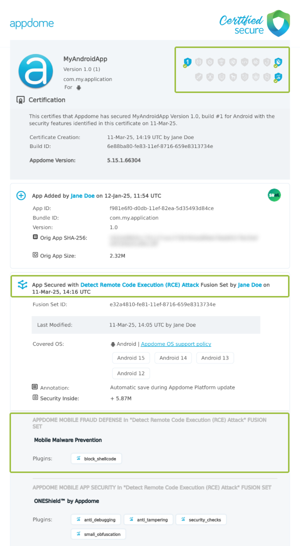 Each Certified Secure™ certificate provides DevOps and DevSecOps organizations the entire workflow summary, audit trail of each build, and proof of protection that Detect Remote Code Execution (RCE) Attack has been added to each Mobile app. Certified Secure provides instant and in-line DevSecOps compliance certification that Detect Remote Code Execution (RCE) Attack and other mobile app security features are in each build of the mobile app.