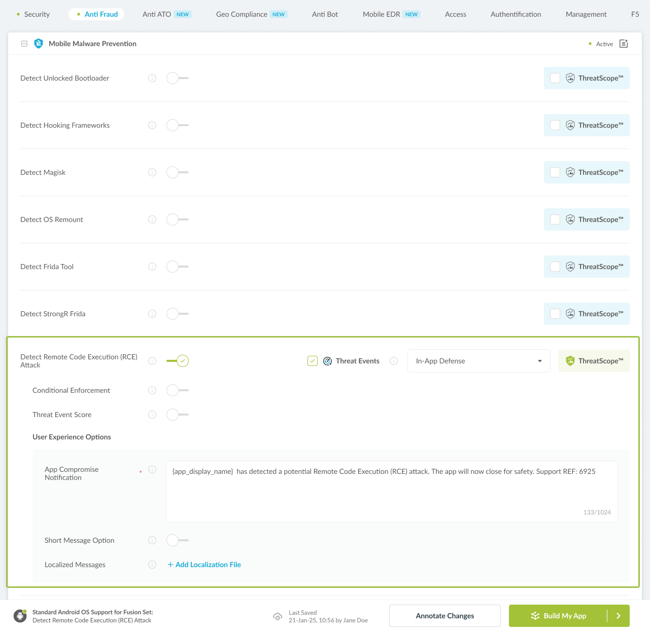 Follow the steps in Sections 2.2-2.2.2 of this article to add the Detect Remote Code Execution (RCE) Attack feature to your Fusion Set via the Appdome Console.