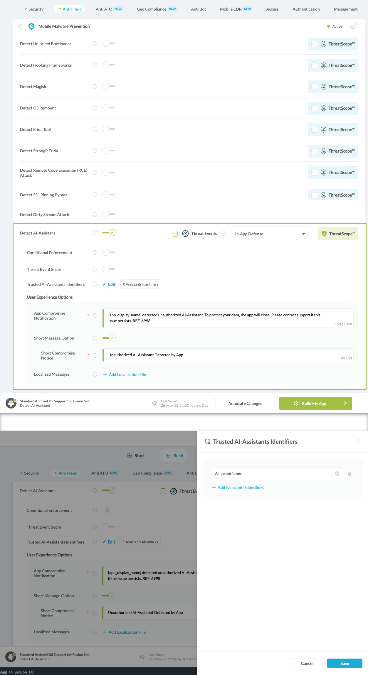 Trusted AI-Assistants Identifiers allows mobile developers to specify which AI Assistants are allowed to run while the app is active. Using a regex-based list of trusted package names, this setting ensures only known, approved AI Assistants—such as Google Assistant—can operate alongside the protected app. If an unapproved AI Assistant is detected and it has on-screen analysis permissions enabled (e.g., analyzing text or images), a threat event is triggered. This control helps prevent malicious AI Assistants from accessing sensitive data, safeguarding high-risk workflows like authentication, transactions, or healthcare interactions.