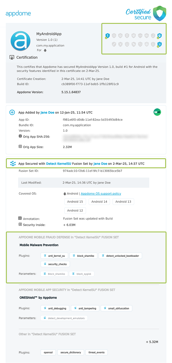 Each Certified Secure™ certificate provides DevOps and DevSecOps organizations the entire workflow summary, audit trail of each build, and proof of protection that Detect KernelSU has been added to each Android app. Certified Secure provides instant and in-line DevSecOps compliance certification that Detect KernelSU and other mobile app security features are in each build of the mobile app.