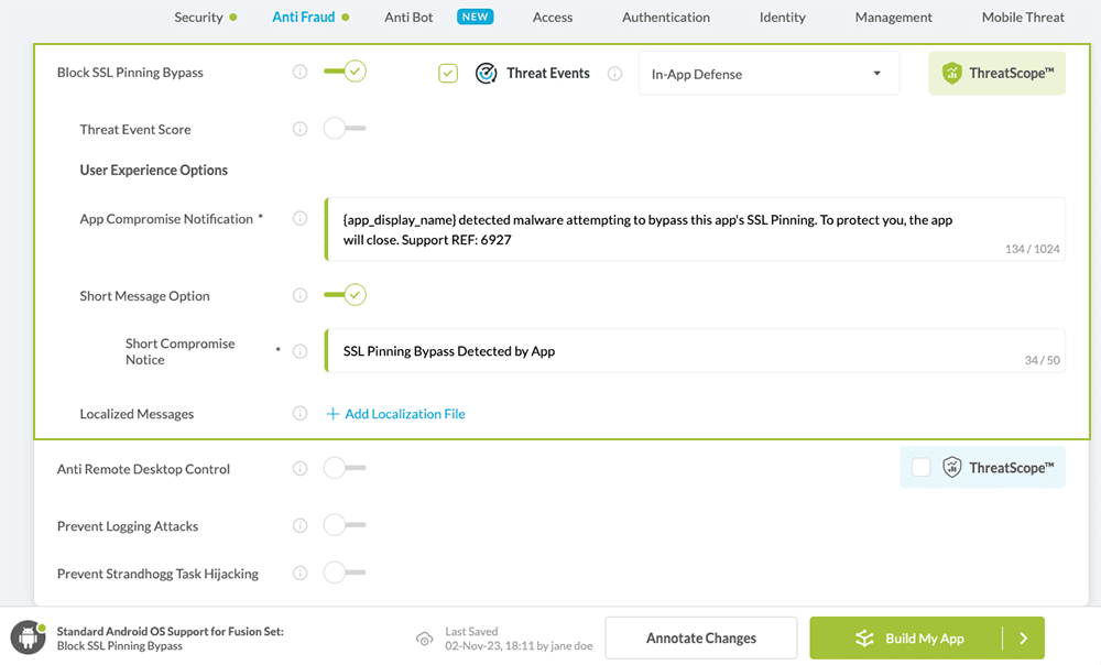 With Threat-Events™ enabled (turned ON), Android developers can get detailed attack intelligence and granular defense control in Android applications and create amazing user experiences for all mobile end users when SSL Pinning Bypass is detected.