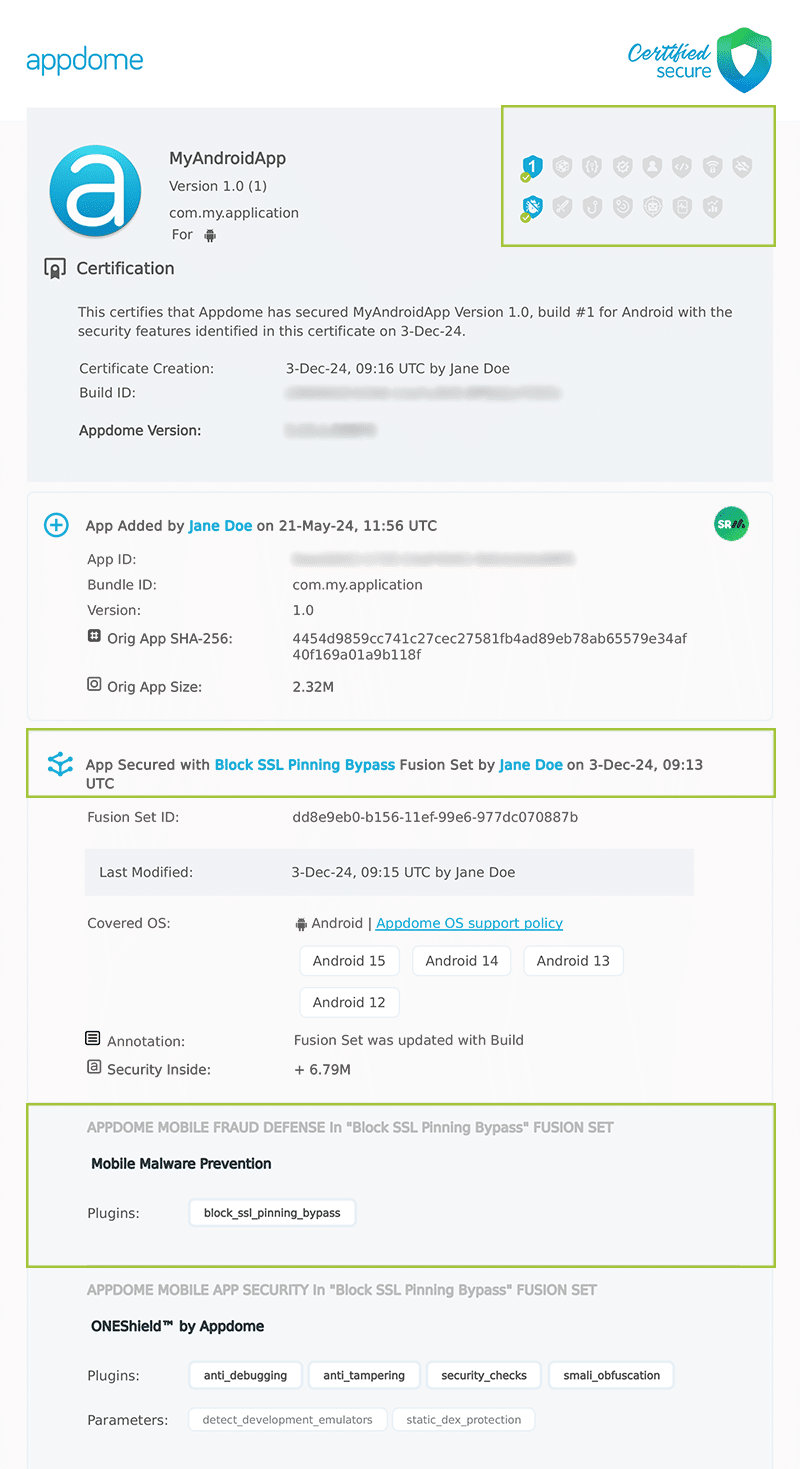 Each Certified Secure™ certificate provides DevOps and DevSecOps organizations the entire workflow summary, audit trail of each build, and proof of protection that Detect SSL Pinning Bypass has been added to each Android app. Certified Secure provides instant and in-line DevSecOps compliance certification that Detect SSL Pinning Bypass and other mobile app security features are in each build of the mobile app.