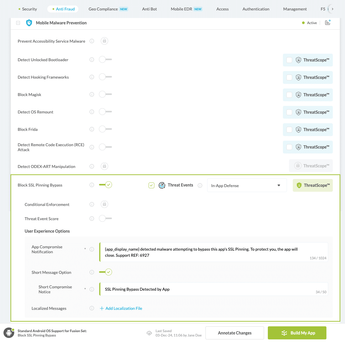 Figure 2: Fusion Set that displays the newly added Detect SSL Pinning Bypass protection