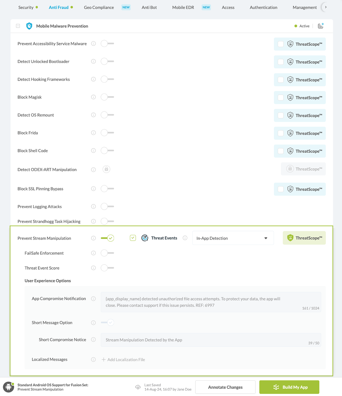 With Threat-Events™ OFF, Appdome provides several user experience options for mobile brands and developers.- App Compromise Notification: Customize the pop-up or toast Appdome uses to notify the user when a threat is present while using the protected mobile app.