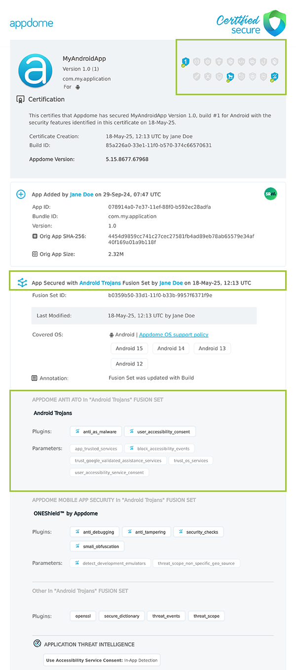 Each Certified Secure™ certificate provides DevOps and DevSecOps organizations the entire workflow summary, audit trail of each build, and proof of protection that Set Trusted Accessibility Services has been added to each Android app. Certified Secure provides instant and in-line DevSecOps compliance certification that Set Trusted Accessibility Services and other mobile app security features are in each build of the mobile app.
