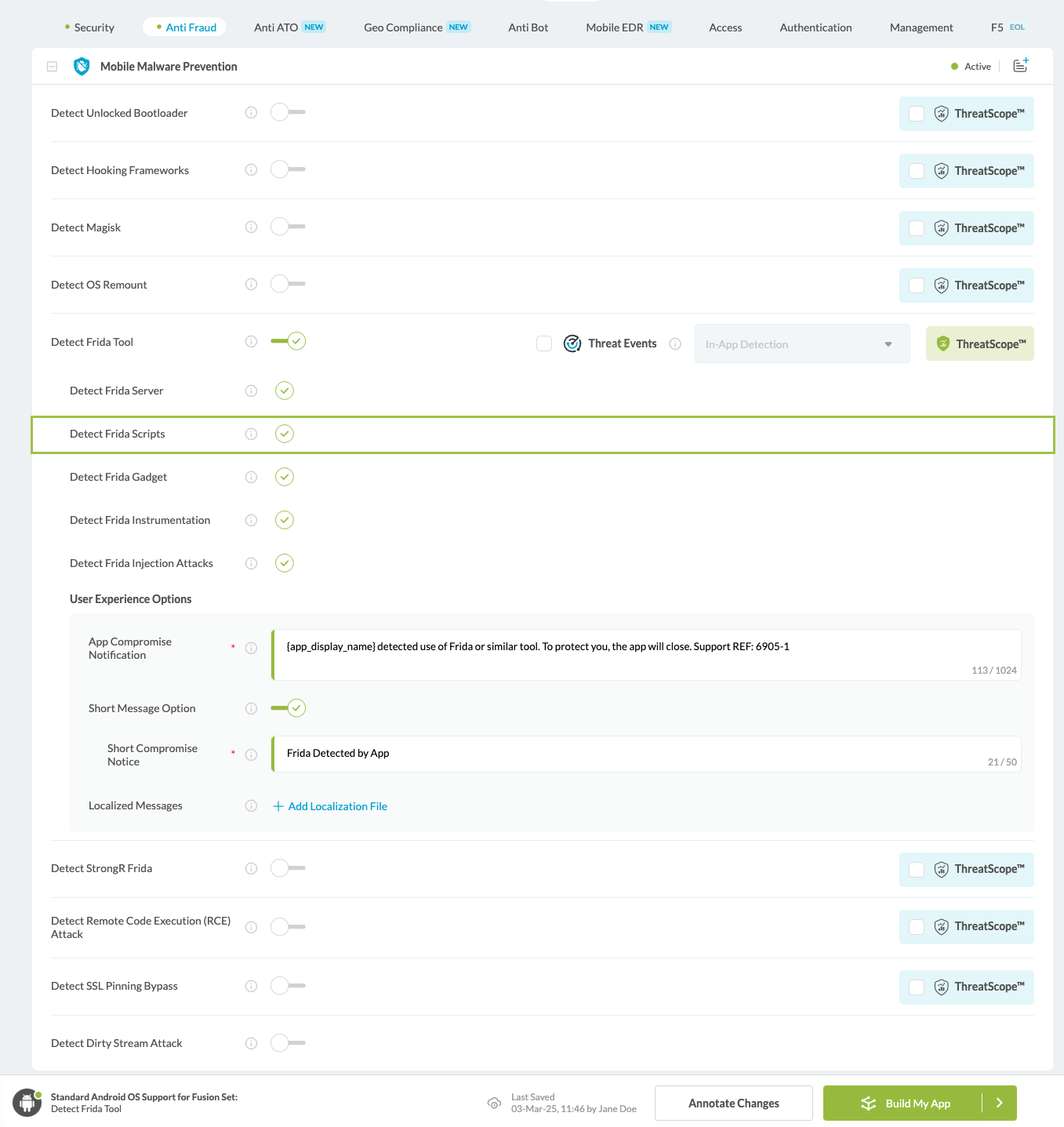 Figure 2: Fusion Set that displays the newly added Detect Frida Scripts protection