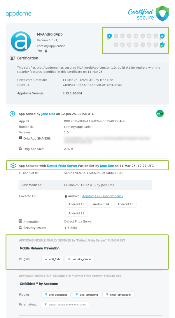 Each Certified Secure™ certificate provides DevOps and DevSecOps organizations the entire workflow summary, audit trail of each build, and proof of protection that Detect Frida Server has been added to each Mobile app. Certified Secure provides instant and in-line DevSecOps compliance certification that Detect Frida Server and other mobile app security features are in each build of the mobile app.