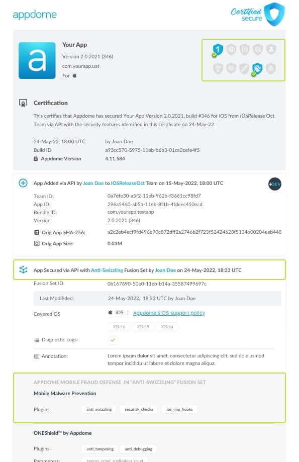 Each Certified Secure™ certificate provides DevOps and DevSecOps organizations the entire workflow summary, audit trail of each build, and proof of protection that Anti-Swizzling has been added to each iOS app. Certified Secure provides instant and in-line DevSecOps compliance certification that Anti-Swizzling and other mobile app security features are in each build of the mobile app.