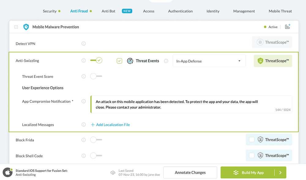 Select the Threat-Event™ in-app mobile Threat Defense and Intelligence policy for Anti-Swizzling: