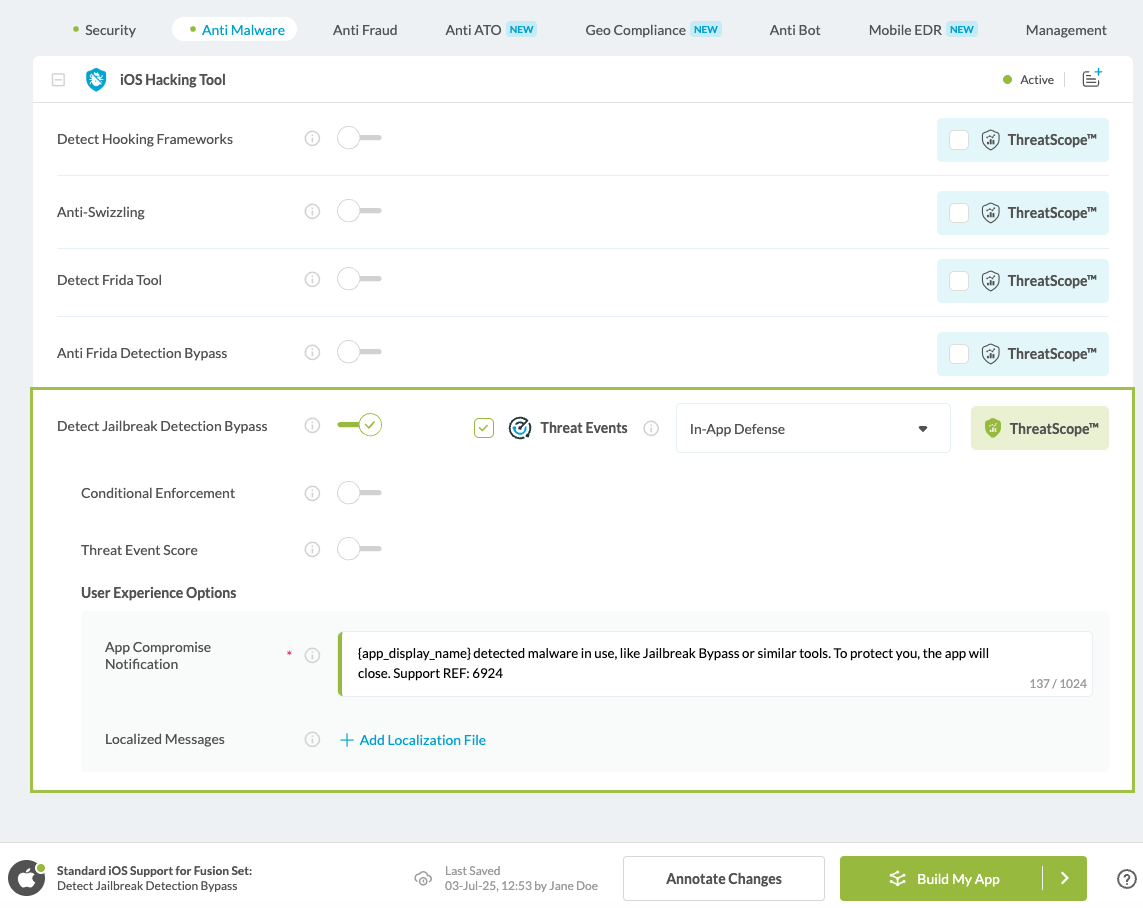 1. Navigate to Build > Anti Malware tab > iOS Hacking Tool section in the Appdome Console.