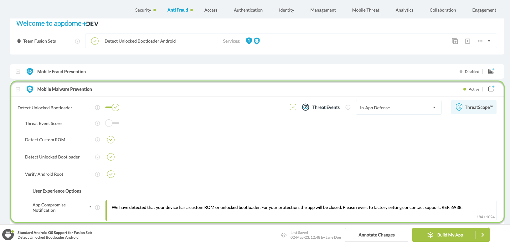 With Threat-Events™ enabled (turned ON), Android developers can get detailed attack intelligence and granular defense control in Android applications and create amazing user experiences for all mobile end users when Unlocked Bootloader is detected.