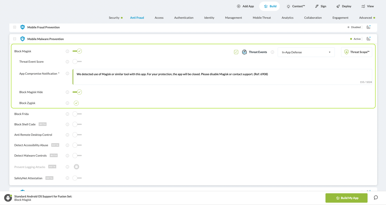2. Follow the steps in Sections 2.2-2.2.2 of this article to add the Detect Magisk feature to your Fusion Set via the Appdome Console.