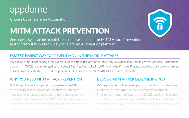 Request a Live Demo and get started with your MitM Attack Prevention project today. Time to market for your mobile app and the mobile app security features you need are equally important. You need to deliver both fast, continuously in your DevOps pipeline. We'll show you how to use Appdome to choose, build, verify and monitor 400+ mobile app defenses in Android & iOS apps at the speed of DevOps. No manual work, No code, No SDKs and no servers needed.