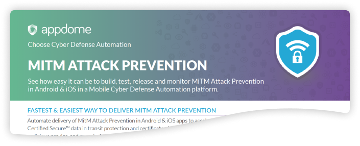 Our MitM Attack Prevention knowledge base contains step-by-step instructions to help you complete Anti-MitM, RASP, Obfuscation, Encryption, Anti-Bot and other projects with ease. Once you configure Appdome's anti-MitM defense features in your CI/CD pipeline, it's easy to create Certified Secure™ mobile apps, monitor attacks and defenses with ThreatScope™, and use Threat-Events™ to create beautiful user experiences when attacks happen.