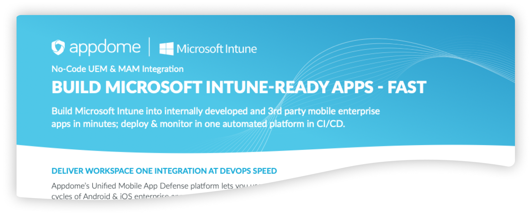 Our Appdome for Microsoft Intune knowledge base has step-by-step instructions to build Microsoft Intune into Android & iOS apps with ease. Once you configure Appdome's Microsoft Intune features in your CI/CD pipeline, it's easy to create Certified Secure™ mobile apps, monitor attacks and defenses with ThreatScope™, and use Threat-Events™ to create beautiful user experiences when attacks happen.