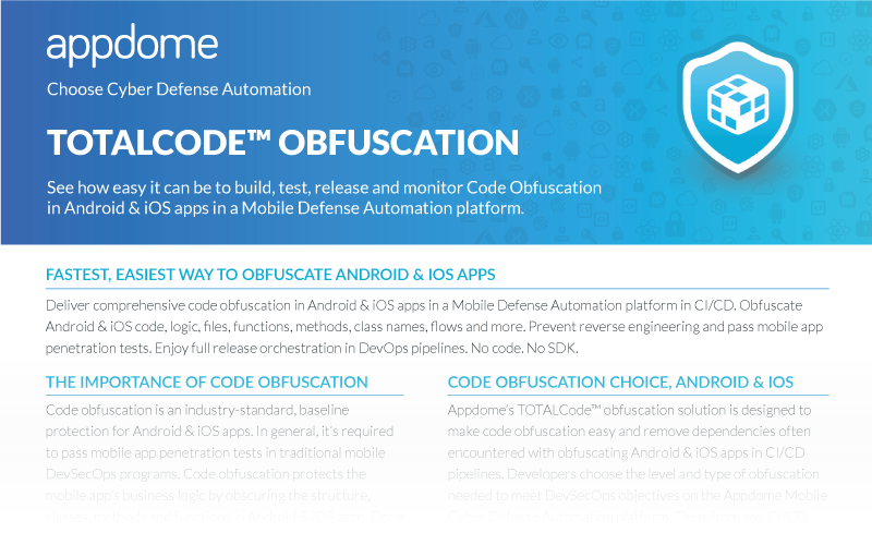 Request a Live Demo and get started with your mobile code obfuscation project today. Time to market for your mobile app and the mobile app security features you need are equally important. You need to deliver both fast, continuously in your DevOps pipeline. We'll show you how to use Appdome to choose, build, verify and monitor 400+ mobile app defenses in Android & iOS apps at the speed of DevOps. No manual work, No code, No SDKs and no servers needed.