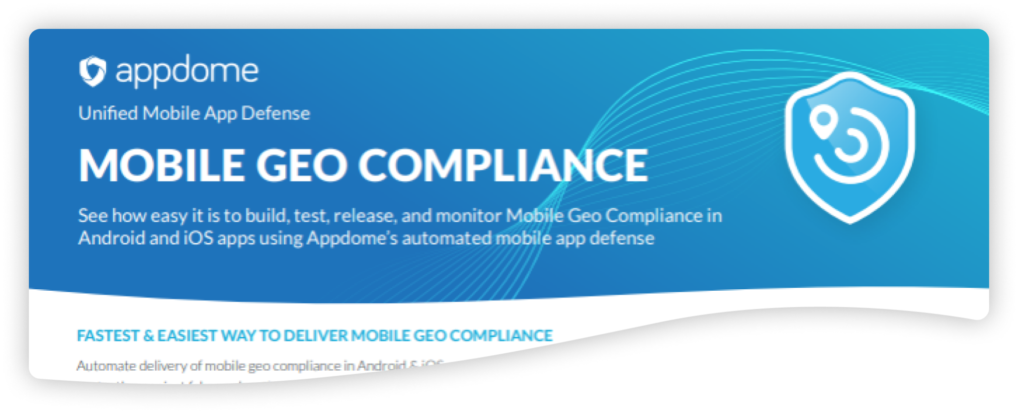 Our Mobile Geo Compliance knowledge base has step-by-step instructions to deploy geo compliance features in Android & iOS apps with ease. Once you configure Appdome's Geo Compliance features in your CI/CD pipeline, it's easy to create Certified Secure™ mobile apps, monitor attacks and defenses with ThreatScope™, and use Threat-Events™ to create beautiful user experiences when attacks happen.